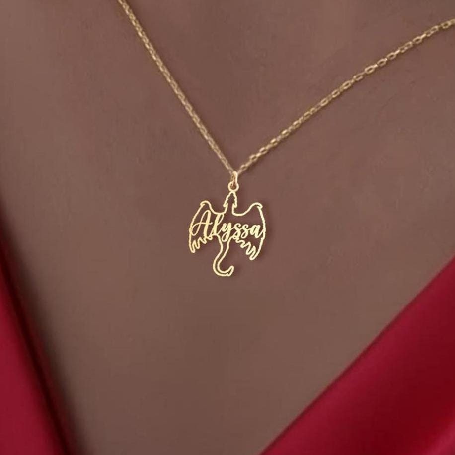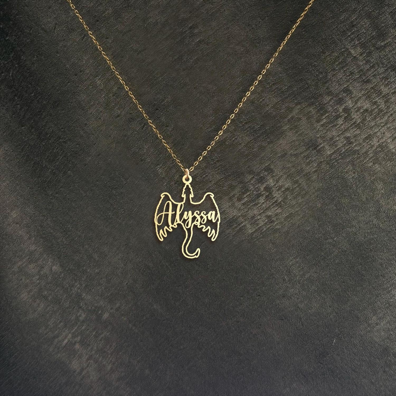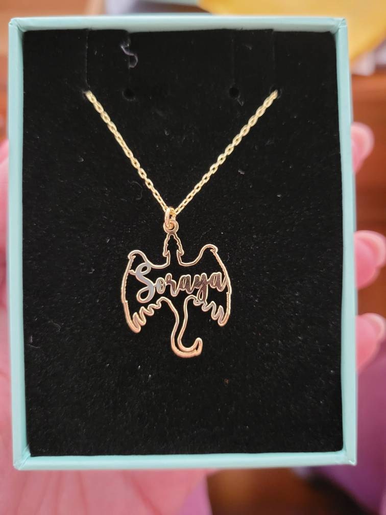 Show your love for fantasy and mythical creatures with this personalized dragon name necklace. Featuring a unique dragon design with your name, this pendant makes a perfect gift for fans of gothic and fantasy art. Available in 925 sterling silver or 18k gold plating, this custom dragon necklace is a striking piece for any jewelry collection.
