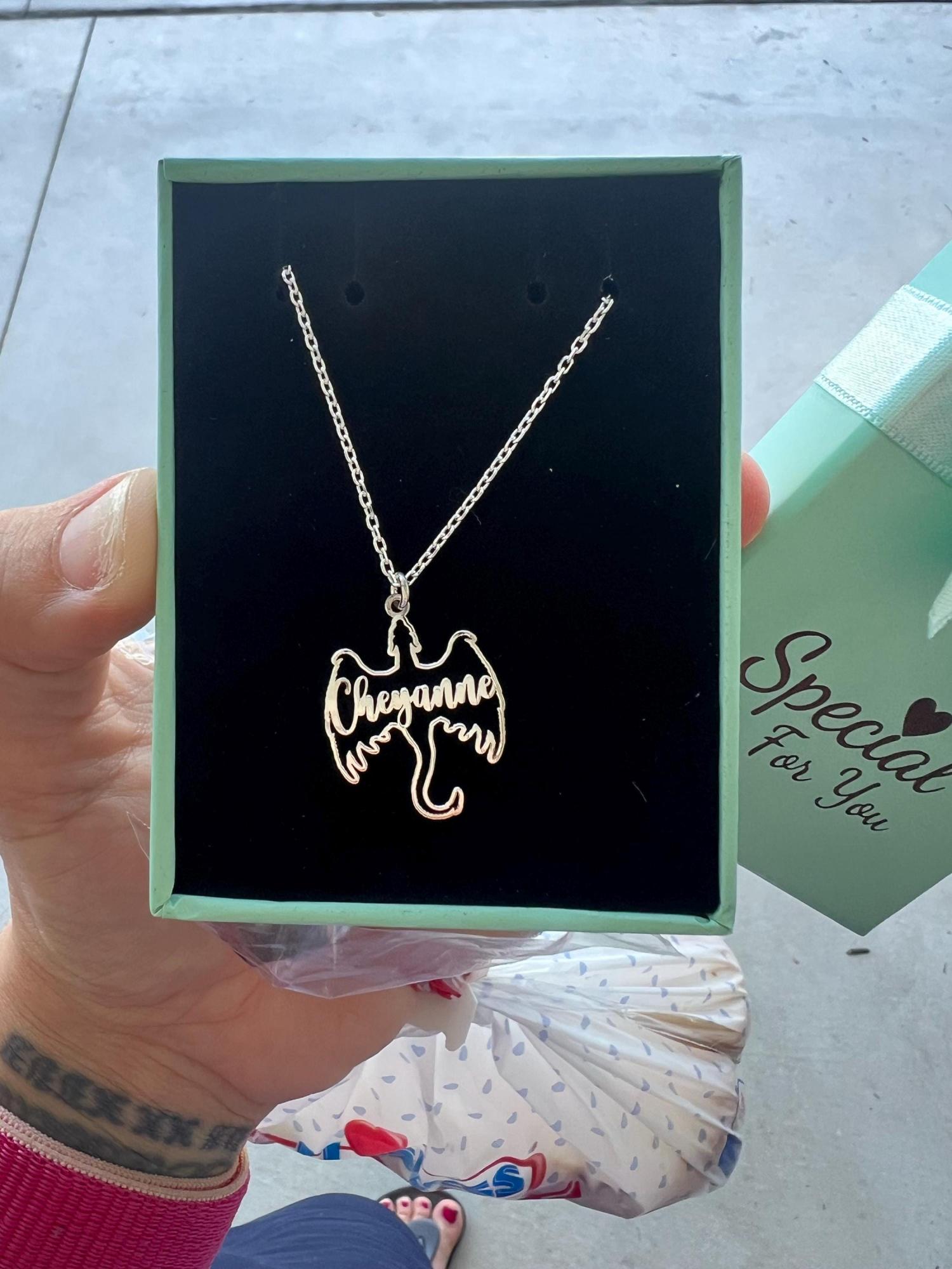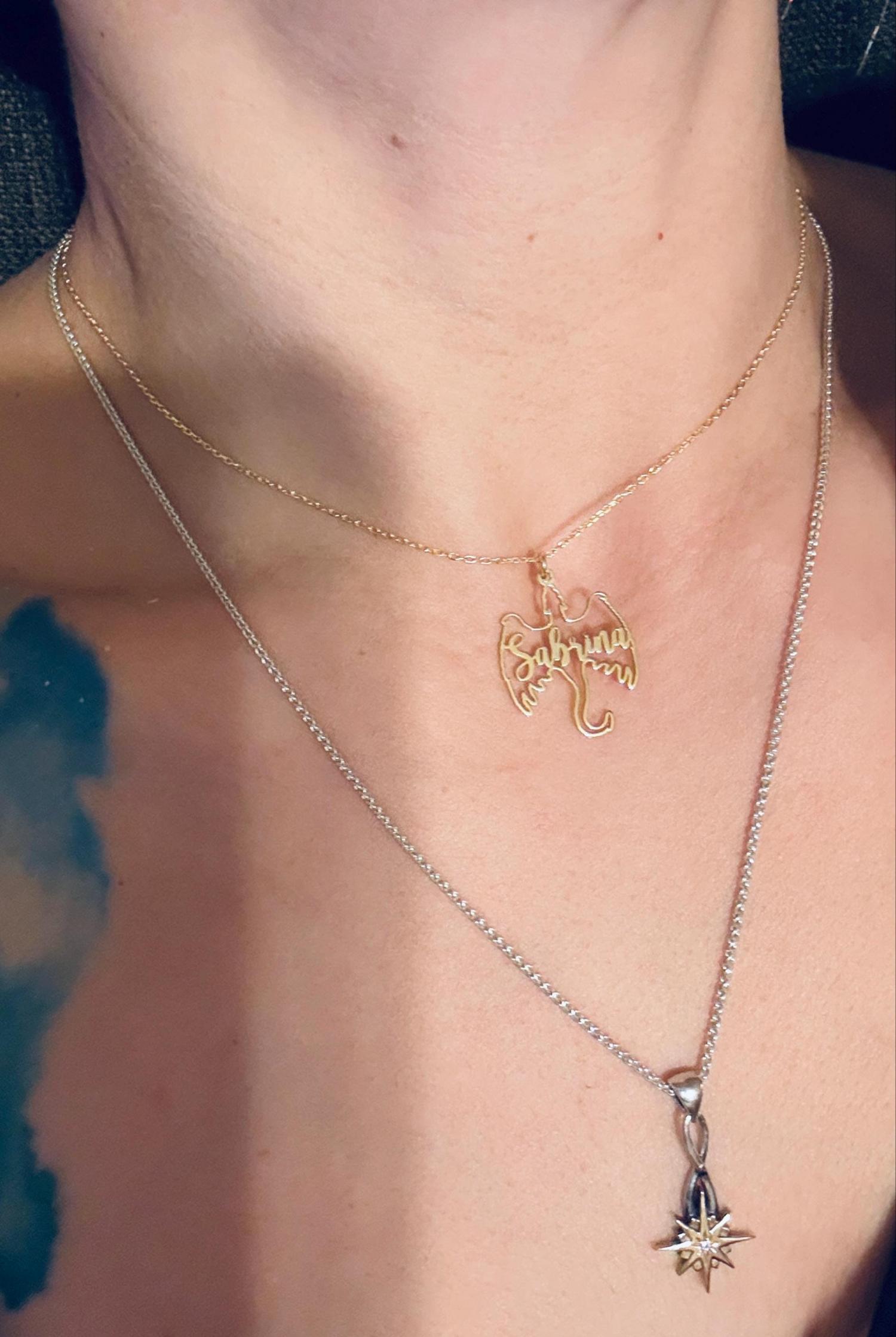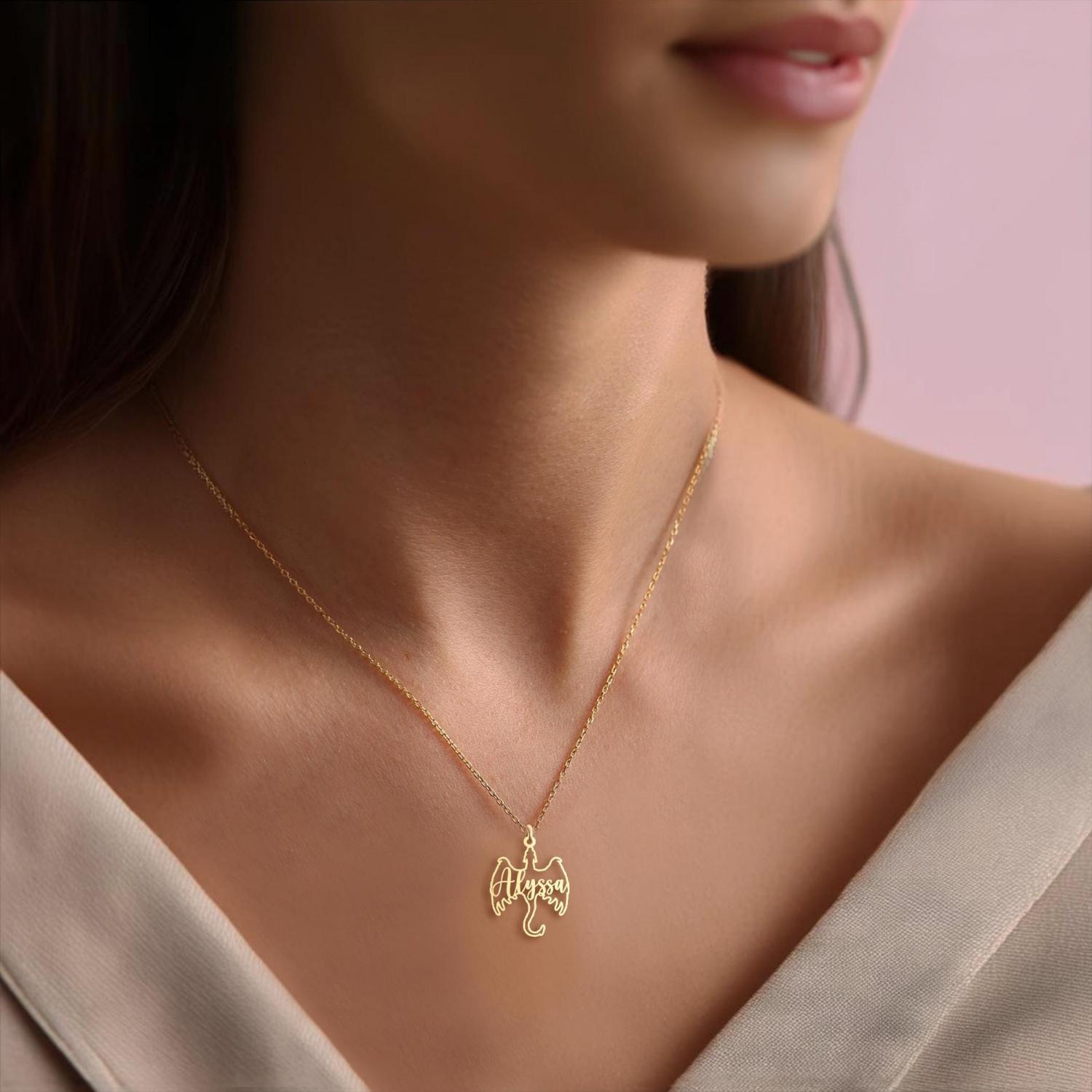 Show your love for fantasy and mythical creatures with this personalized dragon name necklace. Featuring a unique dragon design with your name, this pendant makes a perfect gift for fans of gothic and fantasy art. Available in 925 sterling silver or 18k gold plating, this custom dragon necklace is a striking piece for any jewelry collection.
