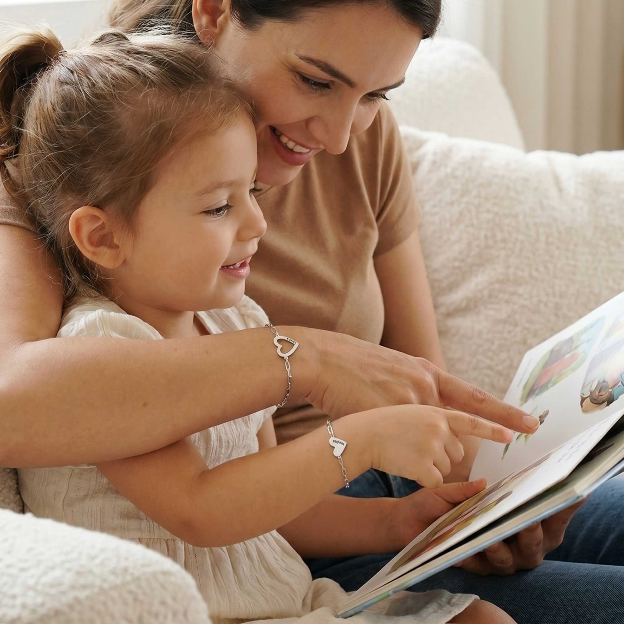 Custom Heart Design - This bracelet set features a heart-inspired style that reflects the bond between mother and child. The look feels soft and meaningful, with two matching bracelets, each detailed with a heart. You can personalize them with the daughter’s and mother’s names on the small and large hearts, creating a sweet and personal expression of love.